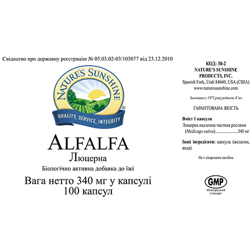 Люцерна посевная (Medicago sativa) - бобовое растение, богато белком, витаминами, фитоэстрогенами, хлорофиллом. Способствует заживлению эрозий, язв, открытых ран, помогает в борьбе с инфекцией, повышает эластичность артерий, снижает уровень холестерина, триглицеридов и сахара в крови, повышает содержание гемоглобина, предупреждает развитие атеросклероза и осложнений диабета. Показана при болезнях желудочно-кишечного тракта, печени, хроническом и остром цистите, простатите, артрите, ревматизме. Люцерна повышает лактацию у кормящих матерей, помогает восстановить нормальный уровень эстрогена, необходима женщинам в период менопаузы и для профилактики рака груди.