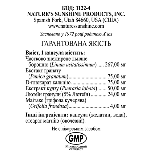 Состав - 1 капсула: порошок льняного семени (Linum usitatissimum) - 267 мг; экстракт граната (Punica granatum) - 75 мг; кальция глюкарат - 75 мг; экстракт корня кудзу (Pueraria lobata) - 50 мг; лютеин (5%) - 24 мг (1,28 мг - 26,5%); грифола курчавая (Grifola frondosa) - 4 мг.