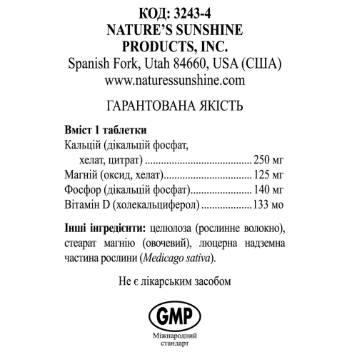 Состав – 1 таблетка: кальций (хелат, цитрат, дифосфат) - 250 мг (25,0% от АСП); магний (хелат, оксид) - 125 мг (31,3% от АСП); фосфор (в дифосфате кальция) - 140 мг (17,5% от АСП); витамин D3 (холекальциферол) - 133 ME (3,33 мкг - 33,3% от АСП); люцерна посевная(Medicago sativa) - 2 мг.