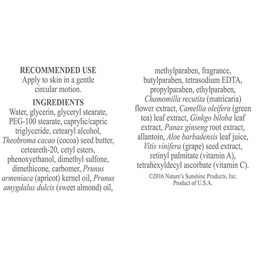 Состав: очищенная вода, глицерин, глицерил стеарат / полиэтиленгликоль-100 стеарат, каприловый/каприновый триглицерид, масло семян какао, цетеариловый спирт / цетеарет-20, цетиловые эфиры, бутилпарабен, метилпарабен, пропилпарабен, этилпарабен, феноксиэтанол, диметил сульфон, диметикон, карбомер, масло абрикосовой косточки, масло сладкого миндаля, отдушка, тетранатрий ЭДТК, экстракт цветков ромашки аптечной, экстракт листьев камелии масличной, экстракт листьев гинкго билоба, экстракт корня женьшеня корейского, аллантоин, сок листьев алоэ, экстракт семян винограда, ретинил пальмитат/ холекальциферол, тетрагексилдецил аскорбат.