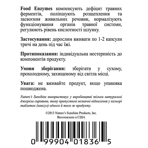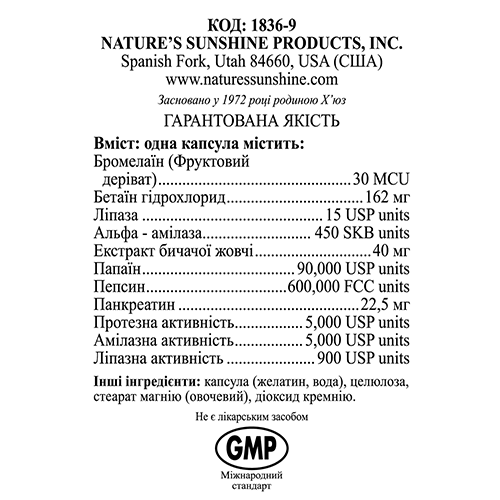 Пищеварительные ферменты компании NSP представляют собой комбинацию ферментов животного и растительного происхождения. Они также содержат источник соляной кислоты в виде бетаина гидрохлорида. Он необходим для тех, у кого желудок выделяет недостаточное количество соляной кислоты.