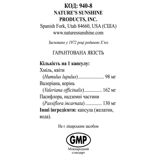 Состав - 1 капсула: корень валерианы лекарственной (Valeriana officinalis) - 162 мг; листья и плоды пассифлоры красно-белой (Passiflora incartanta) - 130 мг; шишки хмеля (Humulus lupulus) - 98 мг.