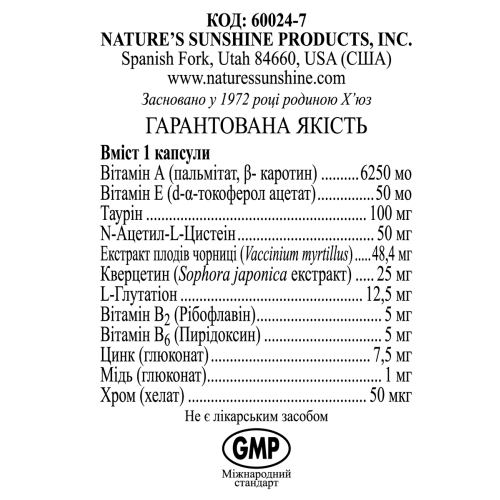 БАД к пище Перфект Айз НСП является дополнительным источником витаминов (Е, А, В2, В6), бета-каротина, лютеина, цинка, меди, хрома, селена, таурина, кверцетина, содержит глутатион, антоцианы.