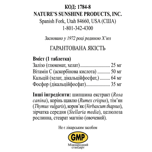 Состав - 1 таблетка: железо (глюконат, хелат) - 25 мг (250% от АСП -муж., 139% от АСП - жен.); витамин С (аскорбиновая кислота) - 50 мг (55,6% от АСП); кальций (хелат / дикальций фосфат) - 64 мг (6,5% от АСП); фосфор - 35 мг (4,4% от АСП); концентрат плодов шиповника собачьего (Rosa canina) - 5,0 мг; корень щавеля курчавого (Rumex crispus) - 1,0 мг; листья тимьяна обыкновенного (Thymus vulgaris) - 1,0 мг; листья коровяка медвежье ухо (Verbascum thapsus) - 1,0 мг; наземные части звездчатки средней (Stellaria media) -1,0 мг.
