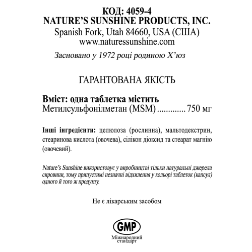 Состав - 1 таблетка: метилсульфонилметан - 750 мг (255 мг серы в органической форме).