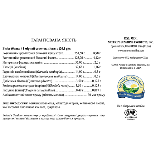 Состав (1 мерная ложка – 20 г): сывороточный белковый концентрат (80% белка) - 7,14 г; сывороточный белковый изолят (93% белка) - 4,08 г; порошок натуральной французской ванили - 1,99 г; подсолнечное масло - 1,49 г; казеинат кальция (92% белка) - 1,06 г; экстракт коры гарцинии камбоджийской (Garcinia cambogia) - 500 мг; корень элеутерококка колючего (Eleutherococcus senticosus) - 500 мг; мальтодекстрин - 500 мг; ксантановая камедь -199 мг; листья джимнемы лесной (Gymnema sylvestre) - 120 мг; экстракт корня родиолы розовой (Rhodiola rosea) - 120 мг; коньюгированная линолевая кислота (CLА) - 80 мг; цветы гвоздики (Syzygium aromaticum) - 20 мг; хром (в хелате аминокислот) - 29,8 мкг (59,6% от АСП).