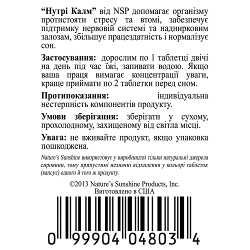 Как справиться с этим? Компания NSP позаботилась о сохранении Вашей нервной системы, разработав новый комплекс Нутри-Калм. Продукт представляет собой уникальную формулу, созданную исключительно для преодоления нервных перегрузок и обеспечивающую оптимальное количество и сочетание витаминов и минералов.