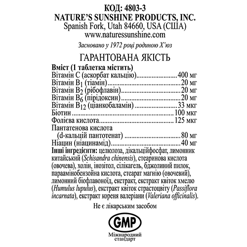 Состав (1 таблетка): Vitamin С - 400 мг, Vitamin B1 - 20 мг, Vitamin B2 - 20 мг, Vitamin B6 - 20 мг, Vitamin B12 - 33 мкг, Фолиевая кислота - 133 мкг, Биотин - 100 мкг, Пантетоновая кислота - 80 мг, Ниациномид - 40 мг.