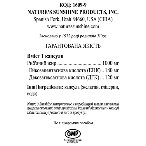 Состав - 1 капсула: жир пищевой из рыбы - 1208 мг; эйкозапентаеновая кислота (ЭПК) - 180 мг (30%); декозагексаеновой кислоты (ДГК) - 120 мг (17% от АСП); витамин Е (d-alfa- tocoferol) - 1 ME (1 мг) (6,7% от АСП)