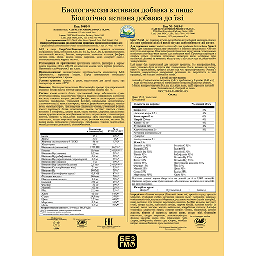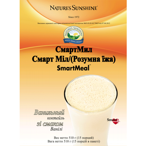 СмартМил / Ванильный коктейль содержит белок, витамины: А, В1, В2, В6, В12, С, D3, Е, фолиевую кислоту, ниацин, пантотеновую кислоту, биотин, биоэлементы: кальций, магний, фосфор, хром, селен, медь, марганец, цинк, йод, калий, которые находятся в хелатной форме, щ-3 ПНЖК, линолевую и г-линоленовую щ-6 ПНЖК. Одна порция коктейля (34 г) содержит 15 грамм белка, 3,5 г жира, 15 г углеводов, 1,18 г - щ-6 ПНЖК и 219 мг - щ-3 ПНЖК. Энергетическая ценность одной порции – 130 ккал. В состав комплекса также входят: среднецепочечные жирные кислоты, лецитин, гуаровая и ксантановая камеди (растворимые в воде некрахмалистые полисахариды).