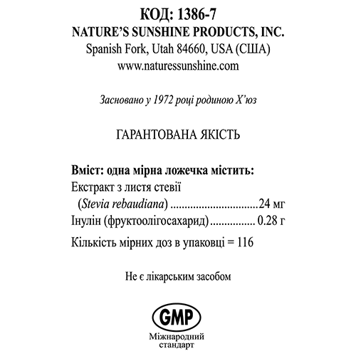 Состав - 1 мерная ложечка (300 мг): экстракт из листьев стевии медовой (Stevia rebaudiana) - 24 мг; инулин (экстракт из корня цикория) - 276 мг.