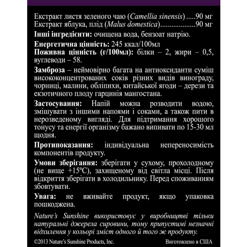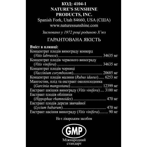 Состав в 15 мл концентрата: концентрат сока виноградного американского (Vitis labrusca) - 1,13 г; концентрат сока винограда обыкновенного (Vitis vinifera) - 1,13 г; концентрат сока голубики (Vaccinium corymbosom) - 677 мг; концентрат сока малины обыкновенной (Rubus idaeus) - 205 мг; экстракт сока и плоды мангостина (Garcinia mangostana) - 406 мг; экстракт кожицы винограда (Vitis Vinifera) - 102 мг; экстракт дерезы обыкновенной (Lycium babarum) - 15 мг; экстракт облепихи (Hippophae rhamnoides) - 15 мг; экстракт косточек винограда (Vitis vinifera) - 2,9 мг; экстракт зеленого чая (Camellia sinensis) - 2,9 мг; экстракт яблочного сока (Malus domestica) - 2,9 мг.